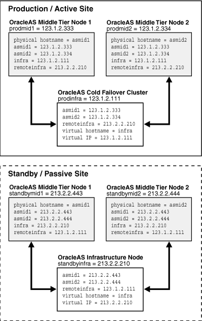 Figure 6-1 depicts an example OracleAS Disaster Recovery solution having a symmetrical topology with a Cold Failover Cluster on the primary site. This is considered a symmetrical topology because from an Oracle Application Server perspective both sites contain two OracleAS middle tiers and one Infrastructure.