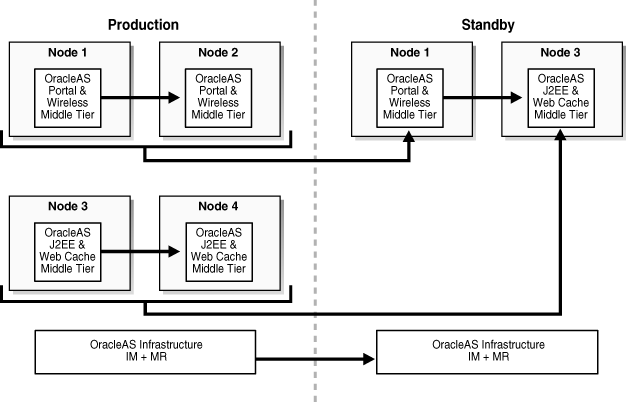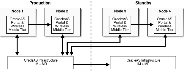 A standby site that maintains OracleAS Disaster Recovery support for the Infrastructure services only, while the middle-tier instances are supported only through production site management. This approach guarantees that only the Infrastructure services are maintained (see Figure 6-3 for an example of this OracleAS Disaster Recovery solution).