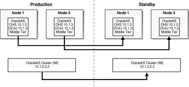 For OracleAS Disaster Recovery Release 10.1.2.0.1, only the OracleAS Disaster Recovery symmetrical topology environment was supported. This OracleAS Disaster Recovery environment has two major requirements: