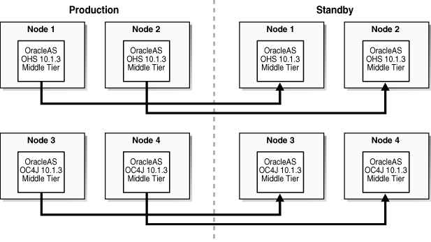 Middle-tier installations are identical between the production and standby sites. In other words, each middle-tier installation in the production site has an identical installation in the standby site. More than one middle-tier node is recommended because this enables each set of middle-tier installations on each site to be redundant. Because they are on multiple machines, problems and outages within a site of middle-tier installations are transparent to clients.
