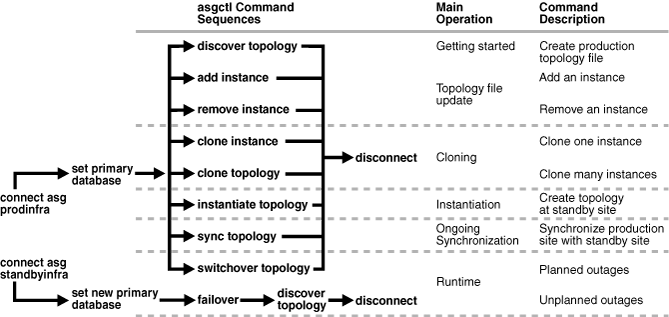 After the production topology is known by OracleAS Guard for a production site, you can execute any one of the subsequent commands to perform a subsequent asgctl operation that involves the standby site. See discover topology for more information.