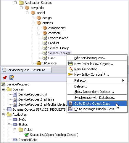 As with all ADF components, when you select an entity object in the Application Navigator, the Structure window displays all of its related implementation files. The only required file is the XML component definition file. You saw above that when translatable UI control hints are defined for a component, it will have a component message bundle file as well. As shown in Figure 6-21, when you've enabled generation of custom Java classes, they also appear under the Sources folder for the entity object. When you need to see or work with the source code for a custom Java file, there are two ways to open the file in the source code editor: