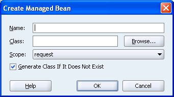 Click the New button to open the Create Managed Bean dialog, as shown in Figure 17-2. Enter the name and fully qualified class path for the bean. Select a scope, select the Generate Java File checkbox, and click OK.