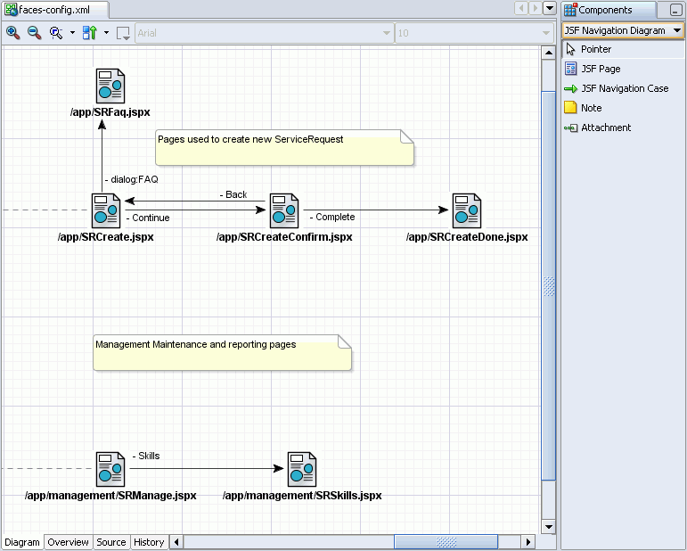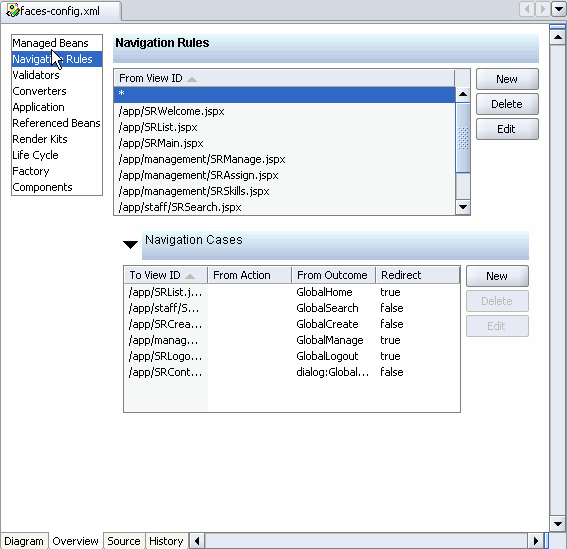 As a starting point for creating navigation rules, use JDeveloper's JSF Navigation Modeler. The navigation modeler is a visual modeling tool for creating application pages and navigation cases for those pages.