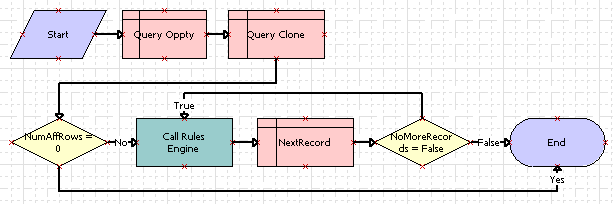 - In the Workflow Processes list, right-click the Opportunity Rules Batch Processing workflow process and choose Edit Workflow Process. In the gridded canvas, model a workflow process similar to the following by clicking and dragging steps and connectors from the palette.