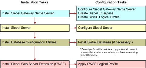 Siebel Installation Guide for Microsoft Windows > Installing Siebel Enterprise Server and Related Components > Overview of Installing and Configuring Servers in a Siebel DeploymentFigure 1 illustrates the general process of installing and configuring the main server elements in a Siebel Business Applications deployment. Note the following: