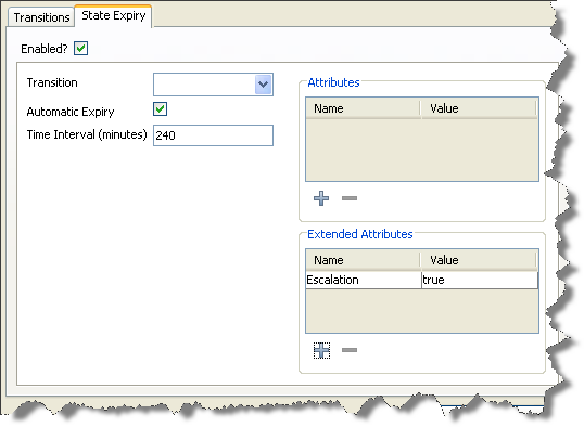 このタブは、状態の失効設定を構成するために使用します。失効設定はオプションで、状態の実行時に実行するアクションを指定します。アクションには、ケースまたはアラートに遷移を適用したり、状態の属性または拡張属性のいずれかの値を変更することを含めることができます。