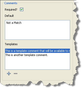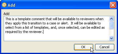 画面のこの部分では、遷移のコメント構成を定義します。遷移は、ケースまたはアラートに適用されるときにコメントの入力を必須とするように構成できます。この遷移の使用で最も一般的なシナリオに対応するデフォルト・コメント、および他の一般的なシナリオに対応する1つ以上のテンプレート・コメントを定義することもできます。