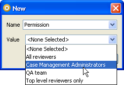 遷移は「Transition」ダイアログで定義しますが、このダイアログは、「Case Management Administration」内の「Workflow Editor」にある「States」タブまたは「Reception」タブからアクセスできます。新しい遷移を作成する場合は「Transitions」リストの下にある「Add...」ボタンを押し、遷移を編集する場合は既存の遷移をダブルクリックして、ダイアログを開きます。