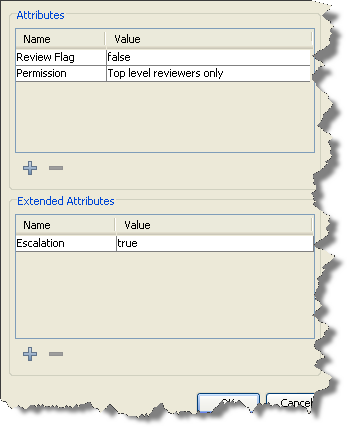 画面のこの部分には、この遷移の使用時にケースまたはアラートの属性および拡張属性に対して行われる変更が表示されます。上のボックスには、ケースまたはアラートの属性に対する変更が表示され、下のボックスには、拡張属性に対する変更が表示されます。