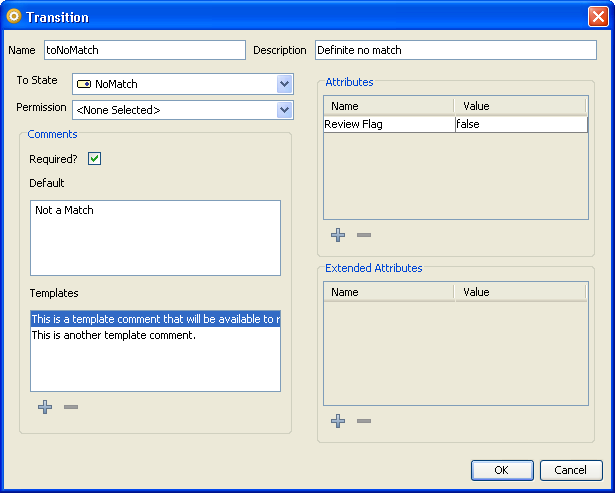 これらの各セクションの詳細は、後述の説明を参照してください。遷移の属性をすべて定義した後は、「OK」ボタンを押して変更内容を保存します。