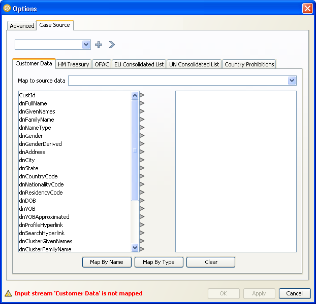 各入力データ・ストリームは、「Case Source」タブのサブタブとして表示されます。サブタブの左側のペインには、入力データ・ストリームに存在するすべてのフィールドのリストがあります。ペインの上には、「Map to source data」というラベルのドロップダウン・ボックスがあります。このドロップダウン・ボックスには、このケース・ソースに構成されたすべてのデータ・ソースが表示されます。