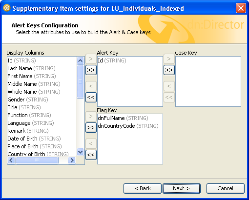 リストの間にある矢印ボタンを使用して、「Display Columns」リストから「Alert Key」リストおよび「Flag Key」リストに列を移動します。一重の矢印ボタンは選択された列を移動し、二重の矢印ボタンは単一の操作でリスト全体を移動します。