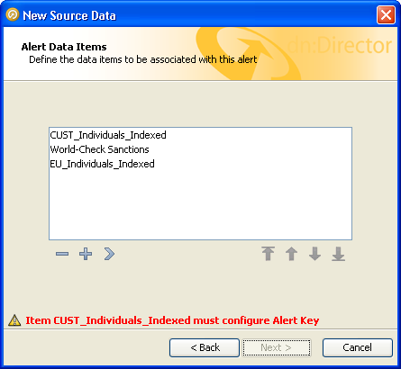 注意: データ・ストリームの順序は、このケース・ソースに生成されるアラート・キーに重要な影響があります。アラート・キーに使用するデータ列は、このリストに定義された順序でアラート・キーに追加されます。複数のアラート・キーにわたって一貫した構成を保持する場合は、データ・ストリームの順序を慎重に設定してください。 たとえば、ウォッチリスト・データの前の作業データからの成果が、アラート・キーに常に含まれるようにする場合は、作業データのデータ・ストリームをデータ・ストリーム・リストのウォッチリスト・データより前にする必要があります。 |