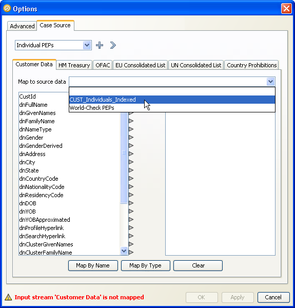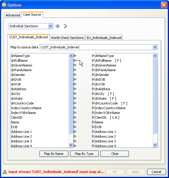 マッチ・プロセッサのケース・ソースを選択または構成した後は、各入力データ・ストリームから適切なデータ・ソースの列にフィールドをマップする必要があります。