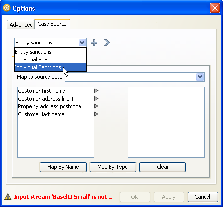 ケース・ソースの構成を変更するには、「Advanced Options」画面の「Case Source」タブで、ドロップダウン・ボックスからケース・ソースを選択して「>」ボタンを押します。既存のソースの構成を変更する手順は、「新規ケース・ソースの作成」に記載されている新規ケース・ソースを作成する手順と同じです。