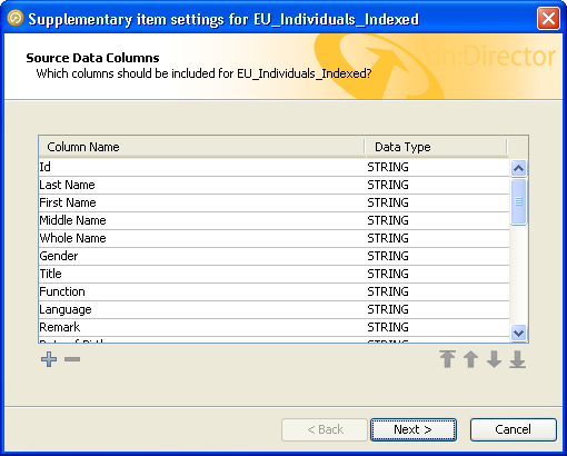 この画面では、データ・ソースに含める列を定義できます。新規のデータ・ソースを定義する場合、このリストには、入力データ・ストリームに存在するすべてのデータ列が自動的に移入されます。「-」ボタンを使用して、レビュー・プロセスに含める必要がない列を削除したり、「+」ボタンを使用して手動で列をさらに追加できます。