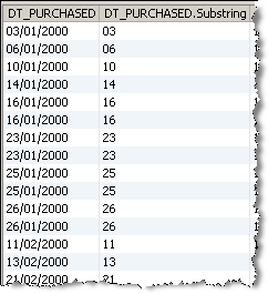 この例では、「Trim Characters」プロセッサを使用して、サービス管理データ例の顧客表から「DT_PURCHASED」属性の日付の日部分(最初の2文字)を返します。