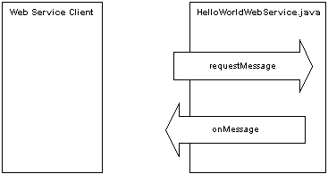 The following diagram shows a web service with two methods: an initiating method and a callback method. The client (typically a web service control) invokes requestMessage to initiate the web service's main process. When the main process is complete (that is, when the response is constructed) the onMessage callback method is invoked that sends the response back to the client.
