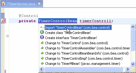 To use TimerControlBean instead, simply change TimerControl to TimerControlBean in the timer control declaration line. This will cause an error marker to appear in the marker bar on the class declaration line because TimerControlBean requires an additional import. Right click on the error marker and choose Quick Fix. The Quick Fix pull-down will appear: