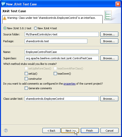 (Notice that you were able to use the control simply by using the @Control field notation and didn't have to programmatically instantiate it yourself. That's the magic of ControlTestCase. By extending that class you inherit its setUp() and tearDown() methods that do the declarative wire-up for you.)