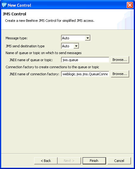 Provided that WebLogic Server is running, you can browse for available JMS queues, topics and connection factories.