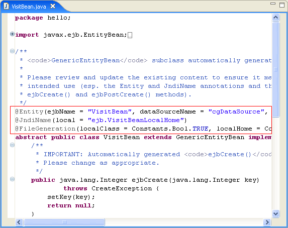Now you'll add code that defines two container-managed persistence (CMP) fields. CMP fields are "virtual" fields represented by columns in a data source, rather than variable definitions in this class. Using the accessors you'll add, VisitBean will get its data from the cgDataSource you specified above in the dataSourceName attribute. The annotations specify the details of the entity bean's correspondence to the data source row.