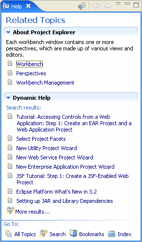 Click on different views or editor tabs on the screen and the Help view will update to show topics relevant to that part of the screen.