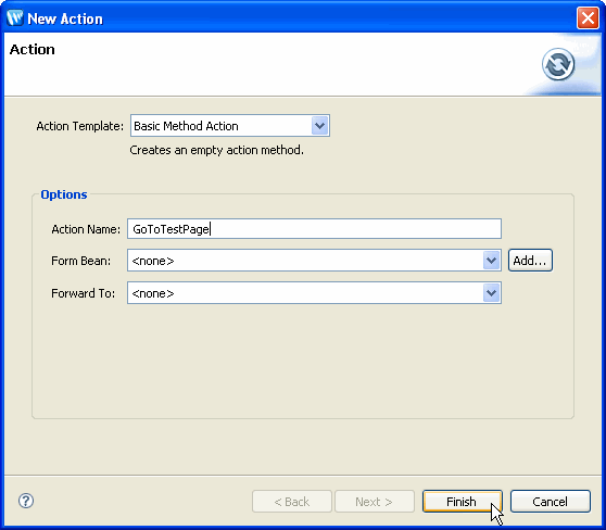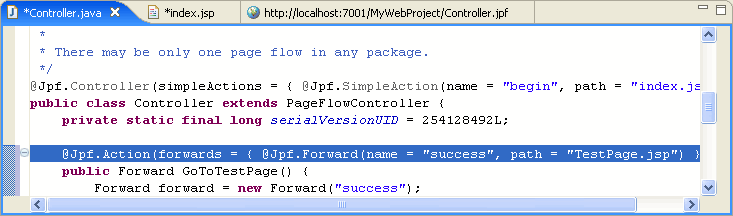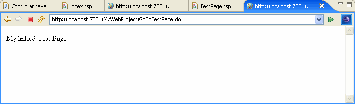 - A new JSP file is created, linked to the GoToTestPage action. If you close the editor window displaying the result of running the original page flow, you can see the change that was made in the index.jsp file.