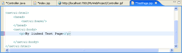 - Right click on the JSP again and click Open to open the file in an editor tab. Change the default text to My linked Test Page in the body of the JSP file.