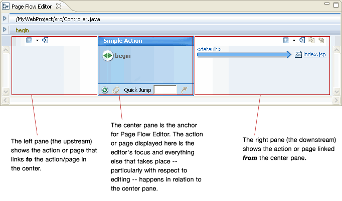 The Page Flow Editor shows the current structure of the page flow. There are three panes on the Page Flow Editor: