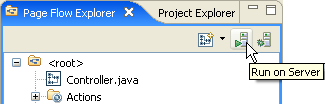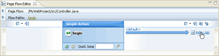The new action appears on the downstream area of the Page Flow Editor and is automatically linked to the JSP page (index.jsp) displayed in the center of the Page Flow Editor .
