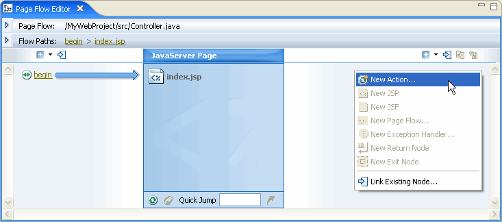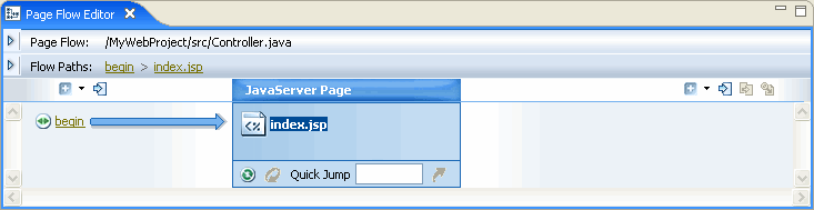 In this case, we have the simple situation of a single action, begin, shown in the center, and the JSP page linked to it, index.jsp.