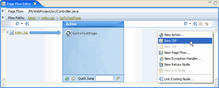 - To create a new JSP page linked to the GoToTestPage action, right click on the downstream pane. Click New JSP.
