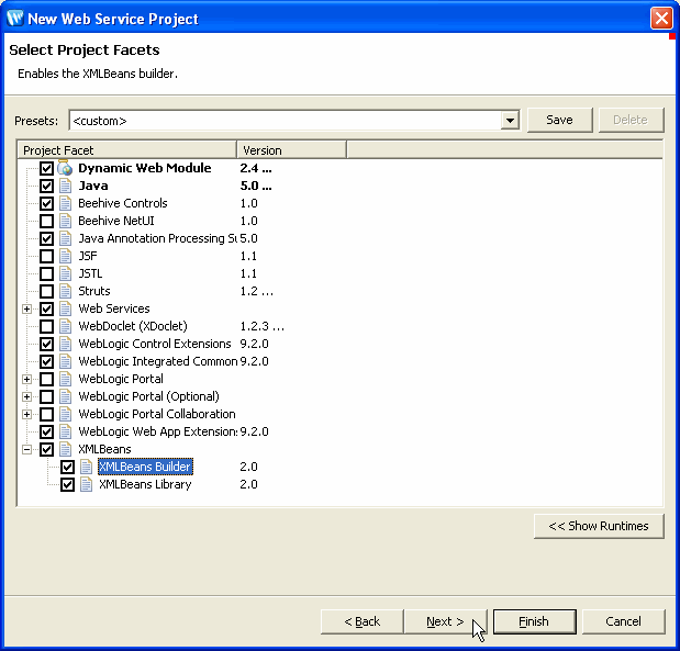 After you've selected the XMLBeans Builder facet, click Next.