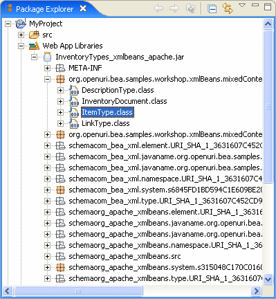 XMLBeans Builder output — Use the IDE's Navigator view to locate Java source and binary files generated during schema compilation. The following illustration shows the default generated file paths as displayed in the Navigator view. Note, too, that compiled CLASS files are put into the build/classes directory with other classes resulting from your project's code.