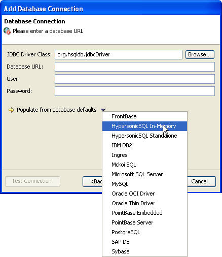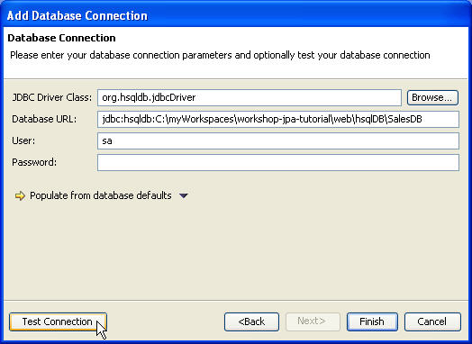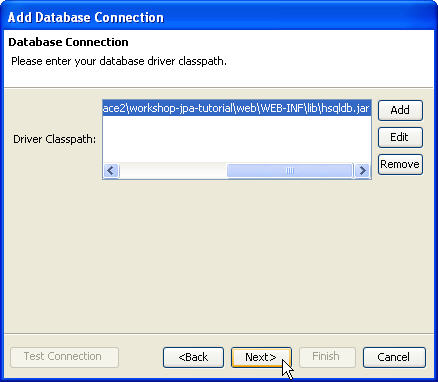 and browse to the Hypersonic JDBC driver file, <path to workspace>\workshop-jpa-tutorial\web\WEB-INF\lib\hsqldb.jar.