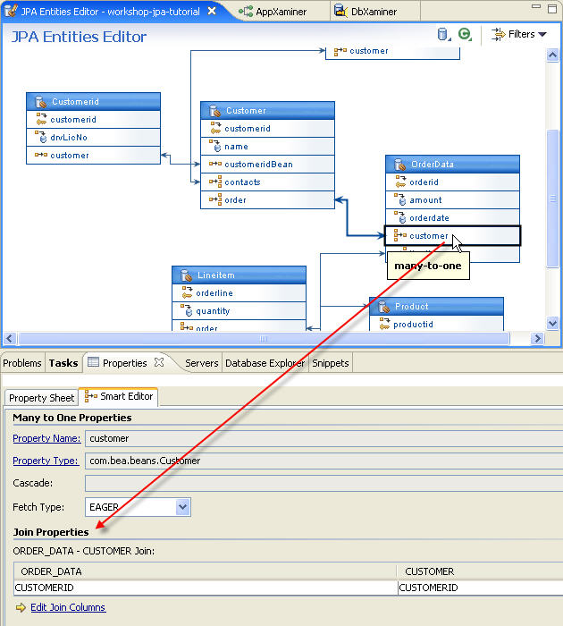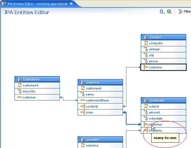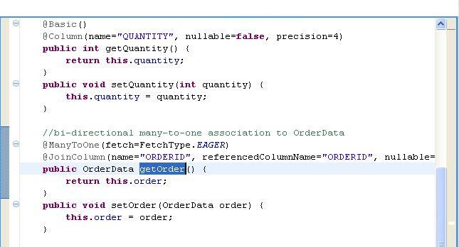 - In the JPA Entities Editor, review the many-to-one association between OrderData