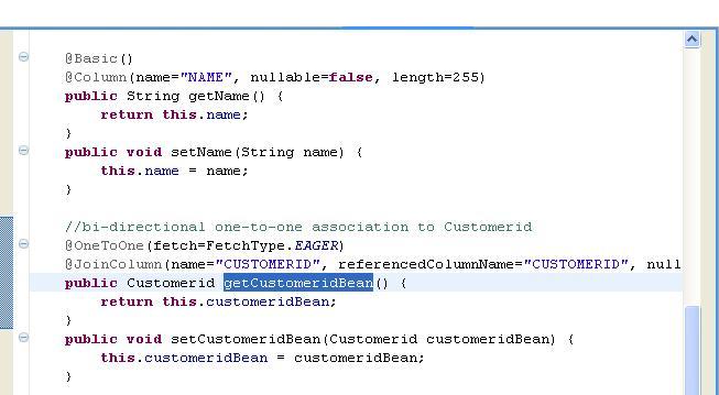 - In the JPA Entities Editor, view the source of the one-to-one association