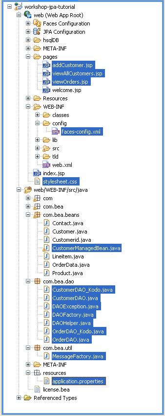 For the web application project workshop-jpa-tutorial the Data Access Layer objects are in the package com.bea.dao. Review the objects in this package.