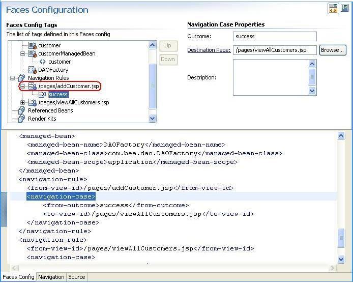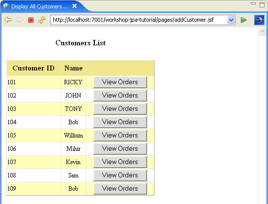 The application calls addCustomer( ) action method of the CustomerManagedBean and forwards the request to viewAllCustomers.jsp,