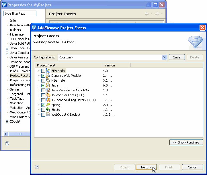 To configure your project for Spring, you can either add the Spring facet when you create the project or you can add the facet to an existing project by clicking Project > Properties, expanding Project Facets and clicking Add/Remove Project Facets .