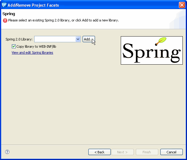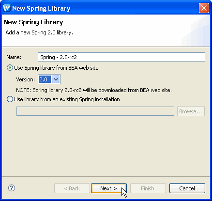 Click Add to get the Spring libraries. The next dialog allows you to download the Spring libraries from the BEA web site, or use Spring libraries that are installed locally.
