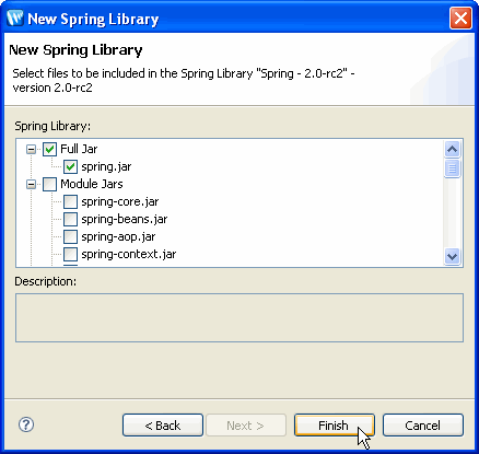 Once you have selected the option you prefer, click Next to continue. The final screen allows you to choose which files should be included. By default, the entire spring.jar library is included.