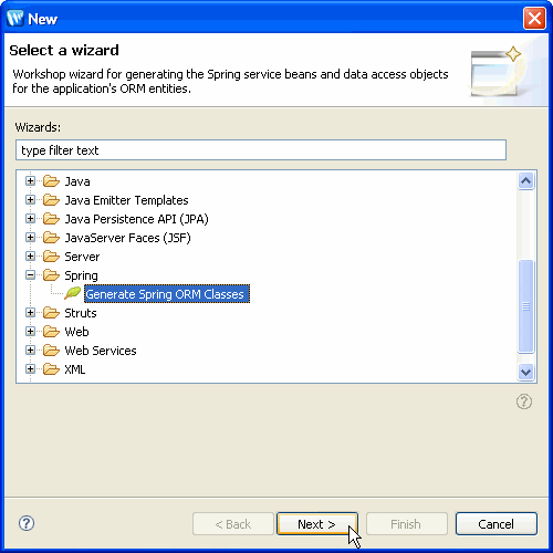 To initiate the Spring artifact generation, right click on the project name in the AppXplorer view and choose File > New > Other. Expand Spring and click on Generate Spring ORM Classes and click Next.