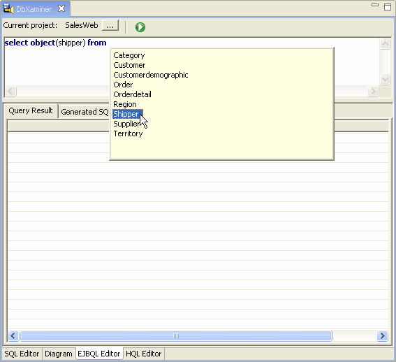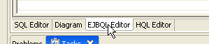The EJBQL and HQL editor provide essentially the same kinds of functionality as the SQL editor, with the exception that queries are executed against entities rather than the database. In other words, you use entity and property names in expressions rather than table and column names. In addition, the editor provides the ability to get corresponding SQL expressions for EJBQL and HQL expressions you build, as shown at the end of this section.