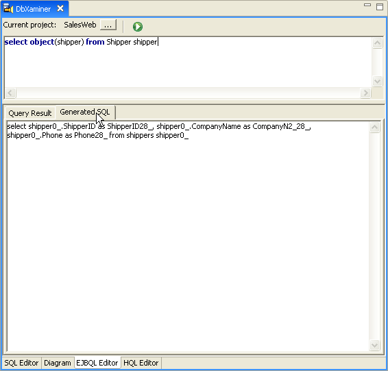 In addition to providing a database diagram, DbXaminer provides three query editors: the SQL Editor, EJBQL Editor (for building EJB Query Language expressions), and HQL Editor (for building Hibernate Query Language expressions). Each of these each features syntax coloring and statement completion for their respective languages.