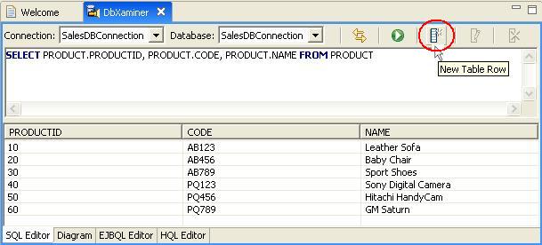 - To add a new row to an existing table, click the New Table Row button in SQL Editor.