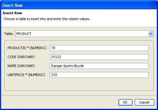 - From within the Insert Row dialog, select the PRODUCT table from the drop down menu and fill in the appropriate column information as shown below.