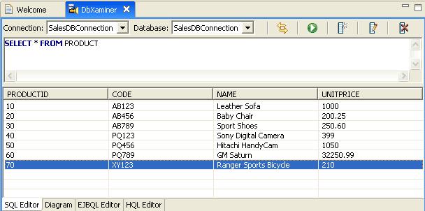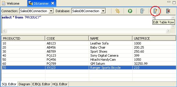 - In the SQL Editor, select the record in the PRODUCT table that has the PRODUCTID value set to 70 and click the Edit Table Row button.